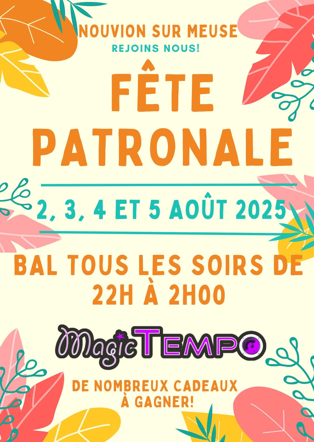 Les 2, 3,4 et 5 aout 2025 : A l’occasion de la fête Patronale, à Nouvion sur meuse, tous les soirs, avec Magic Tempo, nous animerons le bal de 22h à 2h00 !